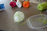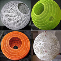 გაბერეთ ბუშტები. ტაშტში ჩაასხით თხევადი წებო. ბუშტზე შემოატარეთ ფერადი ძაფი, მასიურად და ლამაზად, როგორც კი ძაფი შეიწოვს წებოს დავახვევთ ბუშტს. რაც უფრო მჭიდროდ იქნება დახვეწული ძაფი ბუშტზე, უფრო რბილი და თანაბარი იქნება შუქი. თუ გამოიყენებთ ფერად ნათურებს, შეგიძლიათ ძაფებს შორის ადგილი გაზარდოთ.