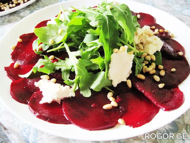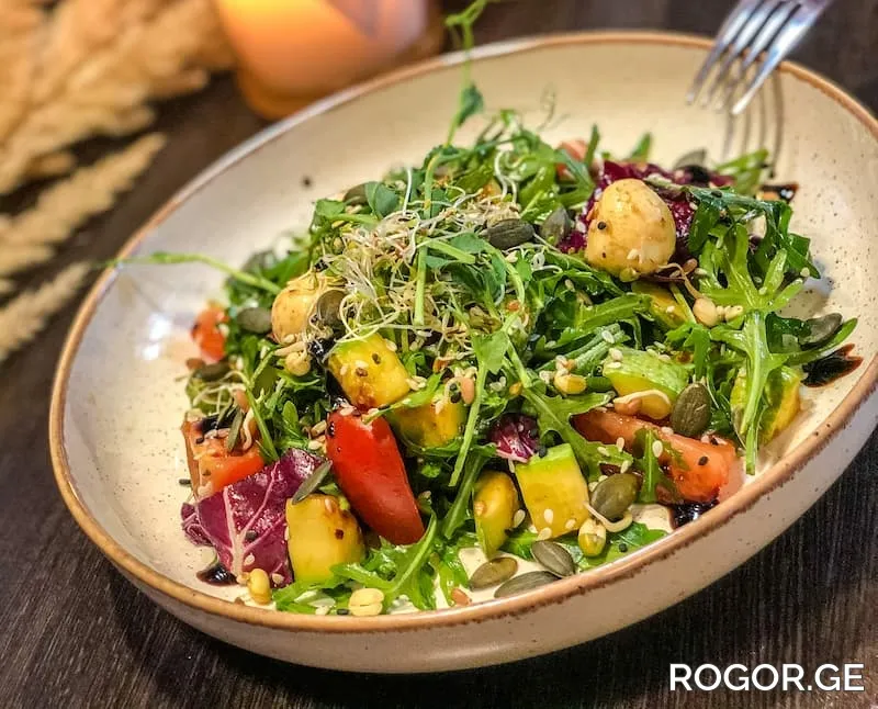 რუკოლას სალათა ყაბაყით, ჩერი პომიდორითა და მოცარელათი