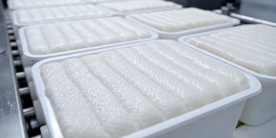 დაჭრა და შეფუთვა: ზოლებს ჭრიან ჩხირებად, თითოეულს ახვევენ ფირში და ყინავენ.